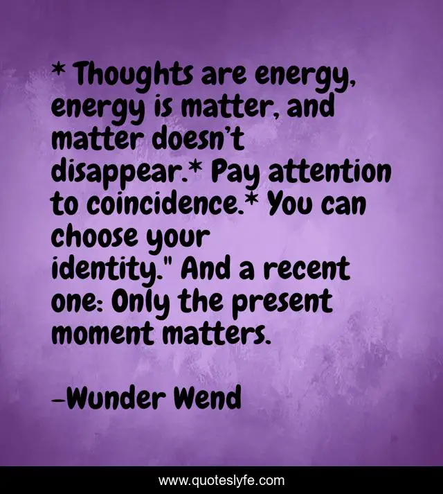 This page presents the quote "* Thoughts are energy, energy is matter, and matter doesn’t disappear.* Pay attention to coincidence.* You can choose your identity." And a recent one: Only the present moment matters.". Author of this quote is Wunder Wend. This quote is about miracles, journaling, probability-theory,.