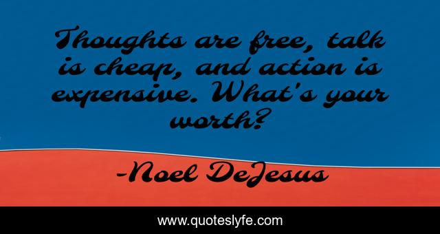 This page presents the quote "Thoughts are free, talk is cheap, and action is expensive. What's your worth?". Author of this quote is Noel DeJesus. This quote is about life, success, life-lesson, motivation, free, self-worth, leadership, ambition, action,.