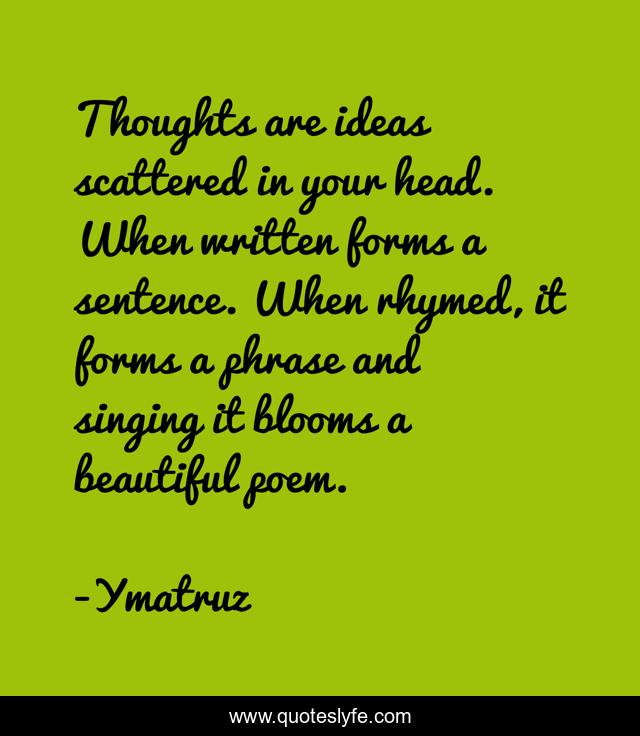 This page presents the quote "Thoughts are ideas scattered in your head. When written forms a sentence. When rhymed, it forms a phrase and singing it blooms a beautiful poem.". Author of this quote is Ymatruz. This quote is about poem, confidence, positive, motivational, poetry, writing, optimistic, inspirational, enthusiasm,.