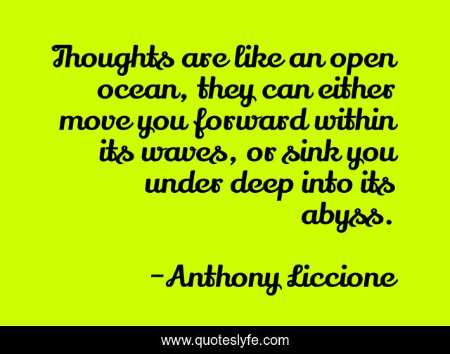 This page presents the quote "Thoughts are like an open ocean, they can either move you forward within its waves, or sink you under deep into its abyss.". Author of this quote is Anthony Liccione. This quote is about staying-centered, positive, confidence, negative, thoughts,.