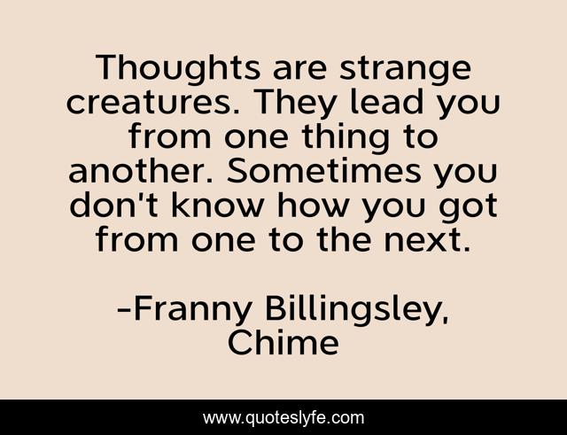 This page presents the quote "Thoughts are strange creatures. They lead you from one thing to another. Sometimes you don’t know how you got from one to the next.". Author of this quote is Franny Billingsley, Chime. .