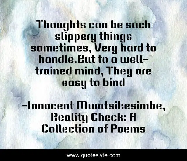 This page presents the quote "Thoughts can be such slippery things sometimes, Very hard to handle.But to a well-trained mind, They are easy to bind". Author of this quote is Innocent Mwatsikesimbe, Reality Check: A Collection of Poems. This quote is about life, positive, motivational, mind, confidence, optimistic, inspirational, enthusiasm, thoughts,.