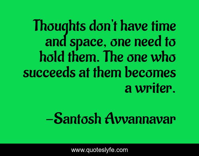 This page presents the quote "Thoughts don't have time and space, one need to hold them. The one who succeeds at them becomes a writer.". Author of this quote is Santosh Avvannavar. This quote is about confidence, positive, motivational, writers, optimistic, inspirational, enthusiasm, book,.