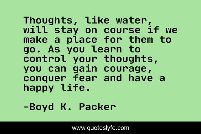 This page presents the quote "Thoughts, like water, will stay on course if we make a place for them to go. As you learn to control your thoughts, you can gain courage, conquer fear and have a happy life.". Author of this quote is Boyd K. Packer. This quote is about self-control, thoughts,.