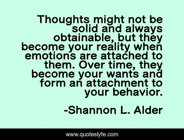 This page presents the quote "Thoughts might not be solid and always obtainable, but they become your reality when emotions are attached to them. Over time, they become your wants and form an attachment to your behavior.". Author of this quote is Shannon L. Alder. This quote is about actions, mind, dreams, thoughts, behavior,.