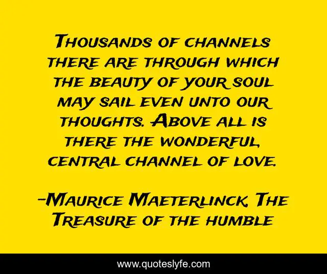 This page presents the quote "Thousands of channels there are through which the beauty of your soul may sail even unto our thoughts. Above all is there the wonderful, central channel of love.". Author of this quote is Maurice Maeterlinck, The Treasure of the humble. This quote is about beauty, love, channel, affection, soul,.