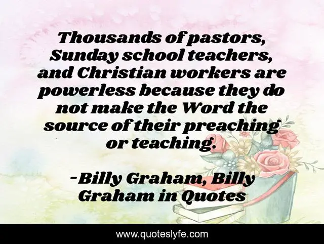 This page presents the quote "Thousands of pastors, Sunday school teachers, and Christian workers are powerless because they do not make the Word the source of their preaching or teaching.". Author of this quote is Billy Graham, Billy Graham in Quotes. This quote is about preaching, billy-graham,.