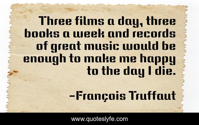 This page presents the quote "Three films a day, three books a week and records of great music would be enough to make me happy to the day I die.". Author of this quote is François Truffaut. This quote is about art, life, books-reading, film, music,.