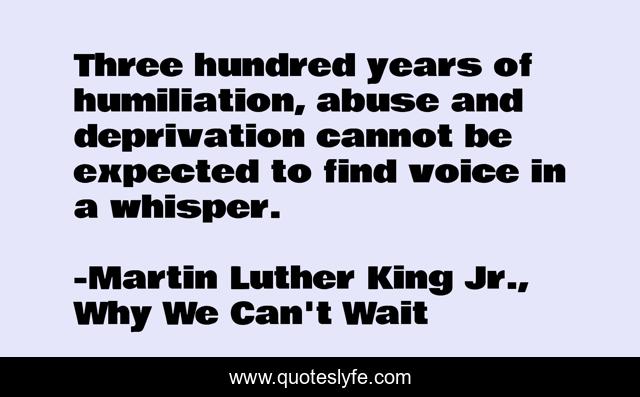 This page presents the quote "Three hundred years of humiliation, abuse and deprivation cannot be expected to find voice in a whisper.". Author of this quote is Martin Luther King Jr., Why We Can't Wait. This quote is about martin-luther-king-jr, civil-rights-movement, racism, slavery, race-relations, corrupt, politics, civil-rights, corruption,.