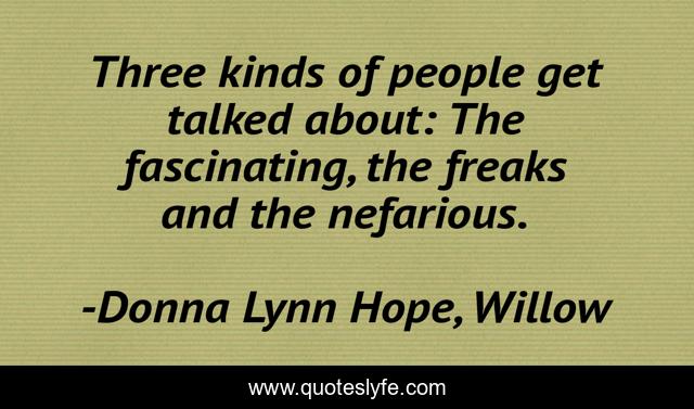 This page presents the quote "Three kinds of people get talked about: The fascinating, the freaks and the nefarious.". Author of this quote is Donna Lynn Hope, Willow. This quote is about gossip, freaks, evil, fascinating, people,.