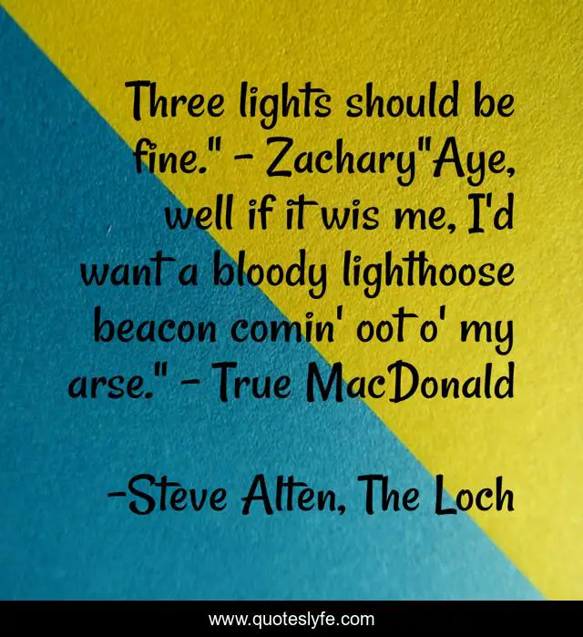 This page presents the quote "Three lights should be fine." - Zachary"Aye, well if it wis me, I'd want a bloody lighthoose beacon comin' oot o' my arse." - True MacDonald". Author of this quote is Steve Alten, The Loch. This quote is about loch, humor, sci-fi, steve-alten,.