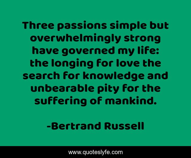 This page presents the quote "Three passions simple but overwhelmingly strong have governed my life: the longing for love the search for knowledge and unbearable pity for the suffering of mankind.". Author of this quote is Bertrand Russell. .