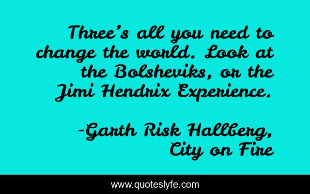 This page presents the quote "Three’s all you need to change the world. Look at the Bolsheviks, or the Jimi Hendrix Experience.". Author of this quote is Garth Risk Hallberg, City on Fire. This quote is about jimi-hendrix, bolsheviks, change,.