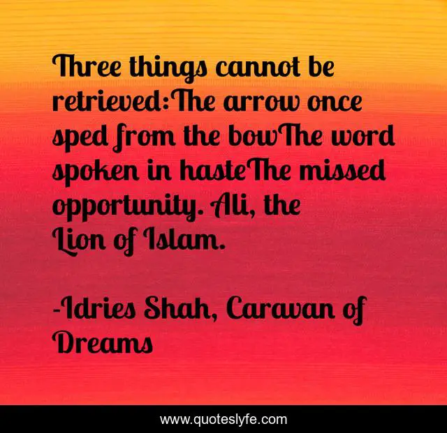 This page presents the quote "Three things cannot be retrieved:The arrow once sped from the bowThe word spoken in hasteThe missed opportunity. Ali, the Lion of Islam.". Author of this quote is Idries Shah, Caravan of Dreams. This quote is about sufi, sufism, sufis, mohammed, ali,.