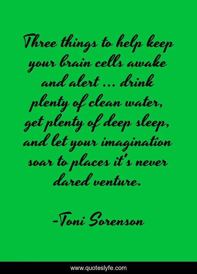 This page presents the quote "Three things to help keep your brain cells awake and alert ... drink plenty of clean water, get plenty of deep sleep, and let your imagination soar to places it's never dared venture.". Author of this quote is Toni Sorenson. This quote is about imagination, brain, life, inspiration,.