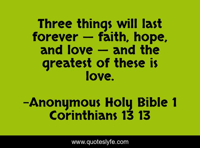 "Anonymous Holy Bible 1 Corinthians 13 13 Quotes." Quoteslyfe.com, 2025. Sat. 06 Dec. 2025. <https://www.quoteslyfe.com/quote/Three-things-will-last-forever-faith-hope-111401>.