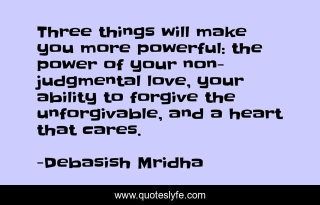 This page presents the quote "Three things will make you more powerful: the power of your non-judgmental love, your ability to forgive the unforgivable, and a heart that cares.". Author of this quote is Debasish Mridha. This quote is about forgive-the-unforgivable, philosophy, debasish-mridha, quotes, debasish-mridha-md, inspirational, non-judgmental-love, enthusiasm, a-heart-that-cares,.