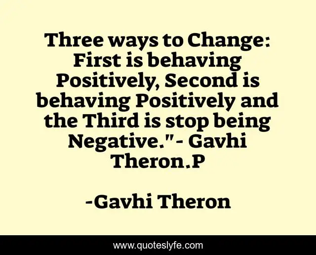 This page presents the quote "Three ways to Change: First is behaving Positively, Second is behaving Positively, and the Third is stop being Negative.". Author of this quote is Gavhi Theron. This quote is about faith, confidence, positive, correction, behaviour, attitude, change,.