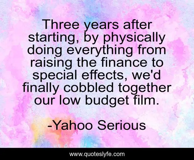 This page presents the quote "Three years after starting, by physically doing everything from raising the finance to special effects, we'd finally cobbled together our low budget film.". Author of this quote is Yahoo Serious. This quote is about budget, together, three,.