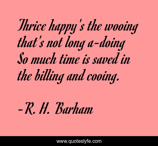 This page presents the quote "Thrice happy's the wooing that's not long a-doing So much time is saved in the billing and cooing.". Author of this quote is R. H. Barham. .
