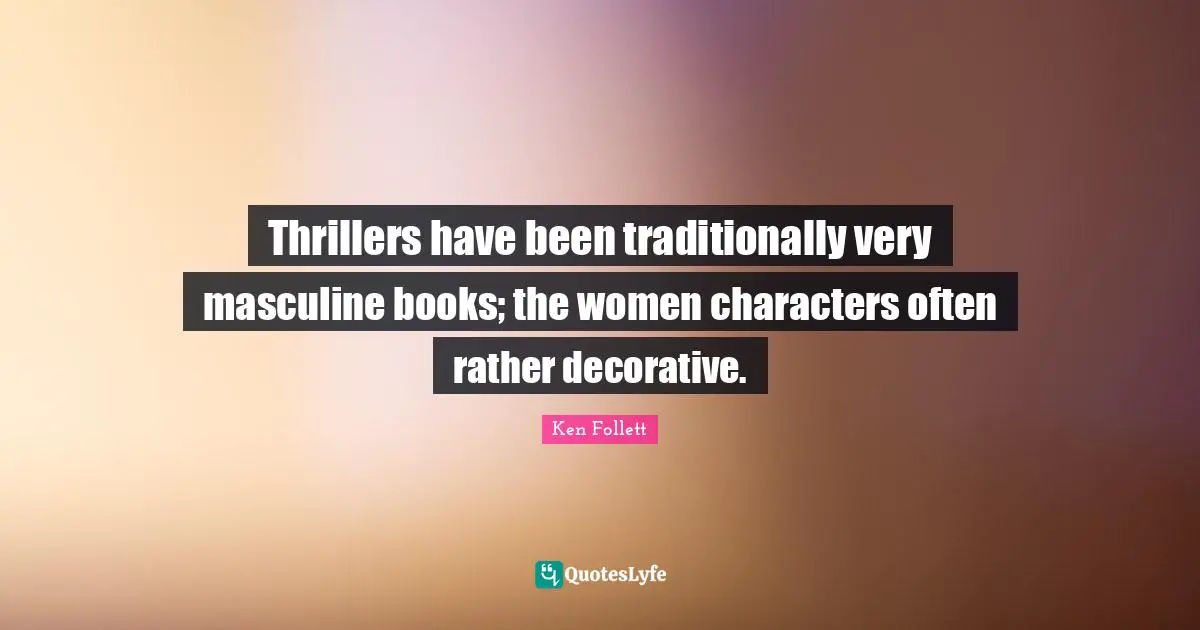 This page presents the quote "Thrillers have been traditionally very masculine books; the women characters often rather decorative.". Author of this quote is Ken Follett. This quote is about masculine, character, women, thrillers, book,.