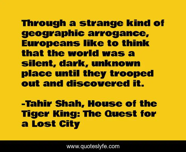 This page presents the quote "Through a strange kind of geographic arrogance, Europeans like to think that the world was a silent, dark, unknown place until they trooped out and discovered it.". Author of this quote is Tahir Shah, House of the Tiger King: The Quest for a Lost City. This quote is about exploration, adventure, arrogance,.