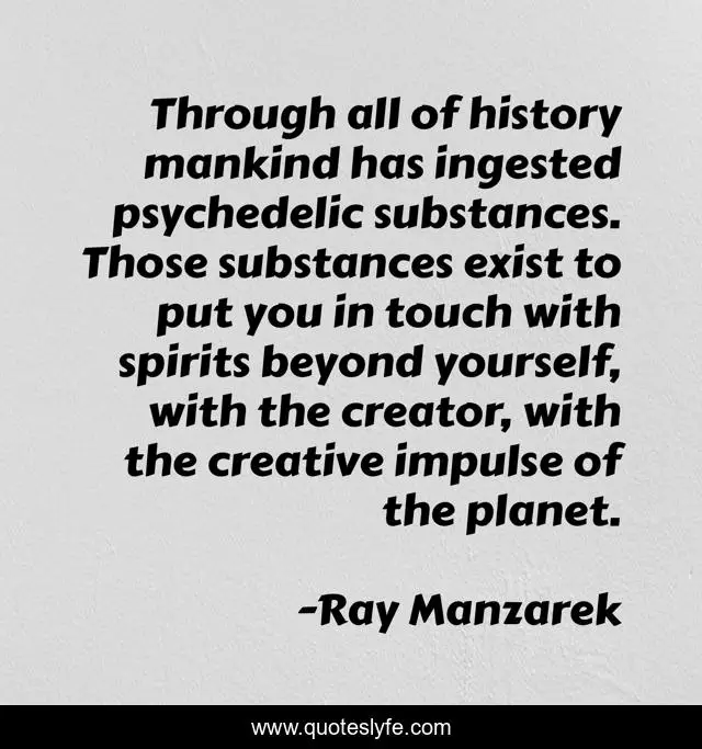This page presents the quote "Through all of history mankind has ingested psychedelic substances. Those substances exist to put you in touch with spirits beyond yourself, with the creator, with the creative impulse of the planet.". Author of this quote is Ray Manzarek. This quote is about creative, yourself,.