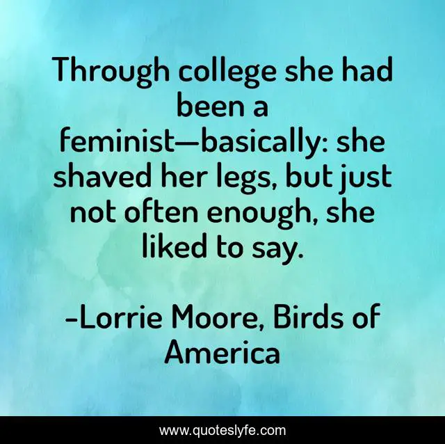 This page presents the quote "Through college she had been a feminist—basically: she shaved her legs, but just not often enough, she liked to say.". Author of this quote is Lorrie Moore, Birds of America. .