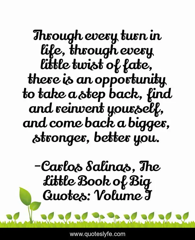 This page presents the quote "Through every turn in life, through every little twist of fate, there is an opportunity to take a step back, find and reinvent yourself, and come back a bigger, stronger, better you.". Author of this quote is Carlos Salinas, The Little Book of Big Quotes: Volume I. This quote is about life, wise, fate, positive, motivational, wise-words, wisdom, quotes, determination,.