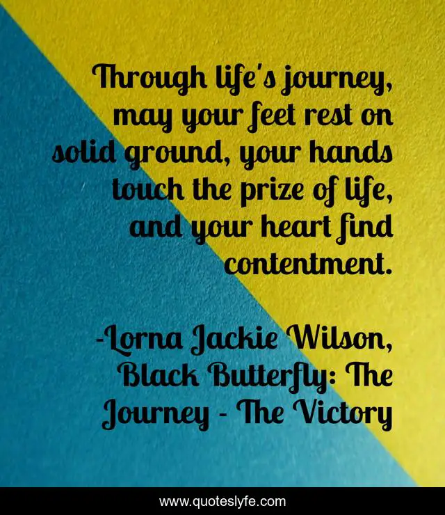 This page presents the quote "Through life's journey, may your feet rest on solid ground, your hands touch the prize of life, and your heart find contentment.". Author of this quote is Lorna Jackie Wilson, Black Butterfly: The Journey - The Victory. This quote is about life, journey,.