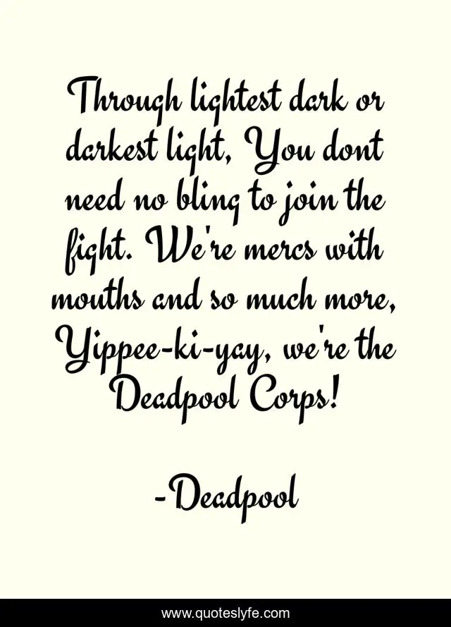 This page presents the quote "Through lightest dark or darkest light, You dont need no bling to join the fight. We're mercs with mouths and so much more, Yippee-ki-yay, we're the Deadpool Corps!". Author of this quote is Deadpool. This quote is about funny, deadpool, comics, deadpool-corps, comedy, marvel,.