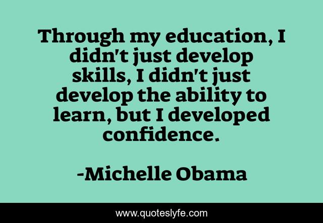 This page presents the quote "Through my education, I didn't just develop skills, I didn't just develop the ability to learn, but I developed confidence.". Author of this quote is Michelle Obama. This quote is about skills, confidence, learn,.
