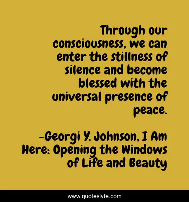 This page presents the quote "Through our consciousness, we can enter the stillness of silence and become blessed with the universal presence of peace.". Author of this quote is Georgi Y. Johnson, I Am Here: Opening the Windows of Life and Beauty. .