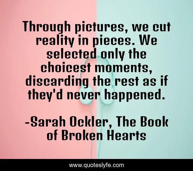 "Sarah Ockler, The Book of Broken Hearts Quotes." Quoteslyfe.com, 2025. Sat. 06 Dec. 2025. <https://www.quoteslyfe.com/quote/Through-pictures-we-cut-reality-in-pieces-164509>.