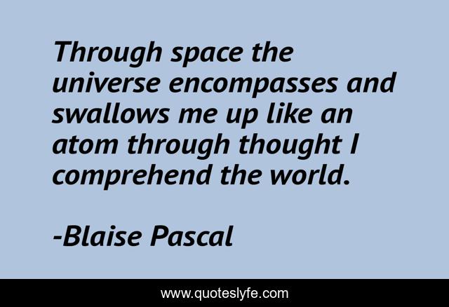 This page presents the quote "Through space the universe encompasses and swallows me up like an atom through thought I comprehend the world.". Author of this quote is Blaise Pascal. This quote is about me, world, universe,.