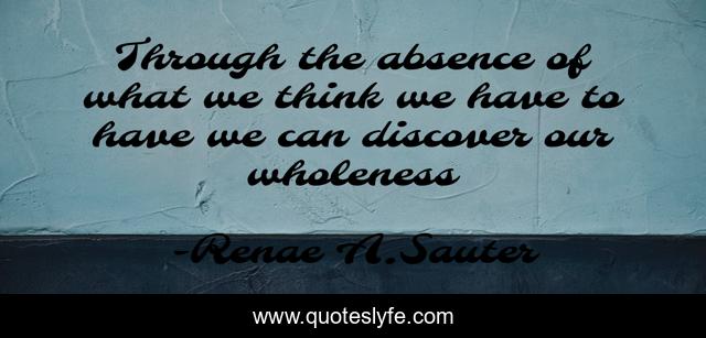 This page presents the quote "Through the absence of what we think we have to have we can discover our wholeness". Author of this quote is Renae A.Sauter. This quote is about empowerment, holistic, psychology, wisdom, thought-leader, mind-body-spirit, inspirational, enthusiasm, wholeness,.