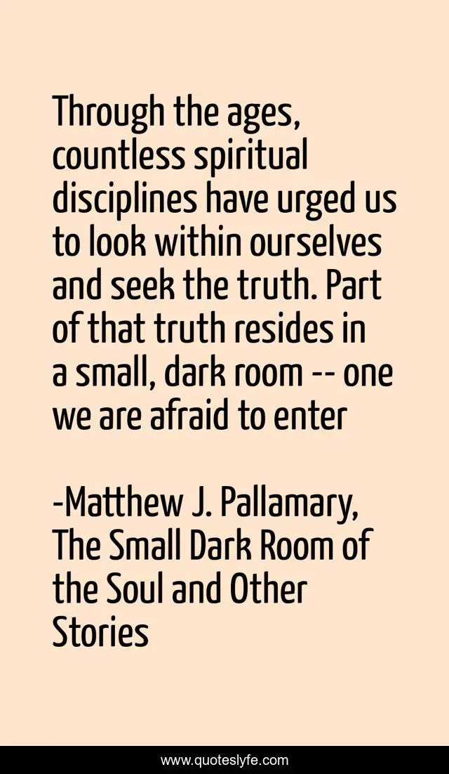 This page presents the quote "Through the ages, countless spiritual disciplines have urged us to look within ourselves and seek the truth. Part of that truth resides in a small, dark room -- one we are afraid to enter". Author of this quote is Matthew J. Pallamary, The Small Dark Room of the Soul and Other Stories. This quote is about horror, psychology,.
