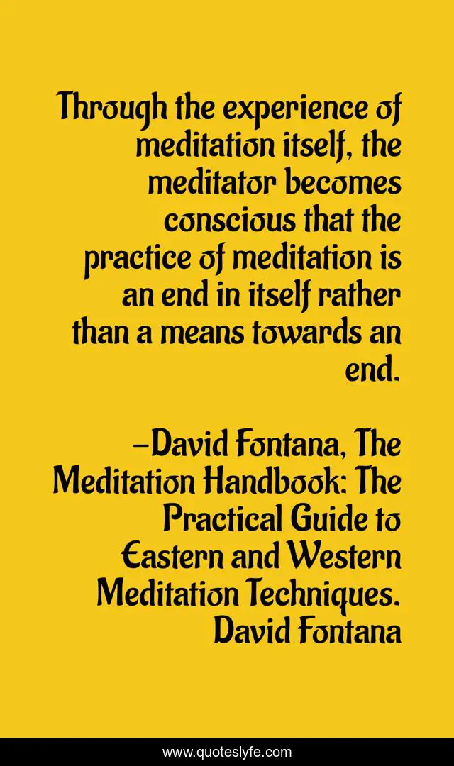 This page presents the quote "Through the experience of meditation itself, the meditator becomes conscious that the practice of meditation is an end in itself rather than a means towards an end.". Author of this quote is David Fontana, The Meditation Handbook: The Practical Guide to Eastern and Western Meditation Techniques. David Fontana. This quote is about spiritualism, meditation, yoga,.