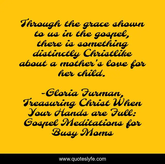 This page presents the quote "Through the grace shown to us in the gospel, there is something distinctly Christlike about a mother's love for her child.". Author of this quote is Gloria Furman, Treasuring Christ When Your Hands are Full: Gospel Meditations for Busy Moms. This quote is about motherhood, parenting, grace, pg40,.