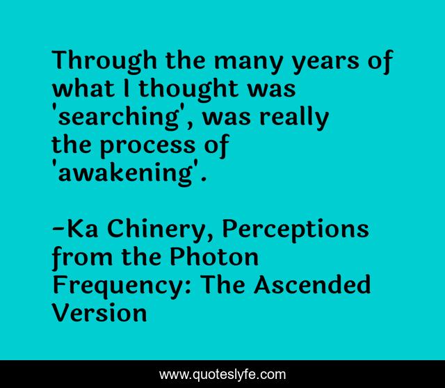 This page presents the quote "Through the many years of what I thought was 'searching', was really the process of 'awakening'.". Author of this quote is Ka Chinery, Perceptions from the Photon Frequency: The Ascended Version. This quote is about awakened-mind, life, searching, search-for-truth, understanding, awakening, clarity, waking-up,.