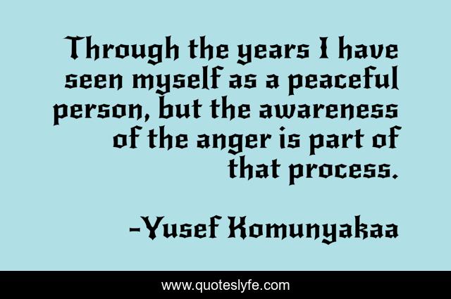 This page presents the quote "Through the years I have seen myself as a peaceful person, but the awareness of the anger is part of that process.". Author of this quote is Yusef Komunyakaa. This quote is about process, myself, peaceful,.