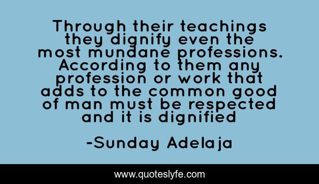 This page presents the quote "Through their teachings they dignify even the most mundane professions. According to them any profession or work that adds to the common good of man must be respected and it is dignified". Author of this quote is Sunday Adelaja. This quote is about mundane, teachings, dignify, profession, respected, most, common, dignified, man,.