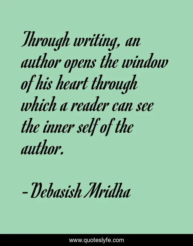 This page presents the quote "Through writing, an author opens the window of his heart through which a reader can see the inner self of the author.". Author of this quote is Debasish Mridha. This quote is about purpose-of-reading, being-an-author, purpose-of-writing, philosophy, debasish-mridha, writing, quotes, debasish-mridha-md, inspirational,.