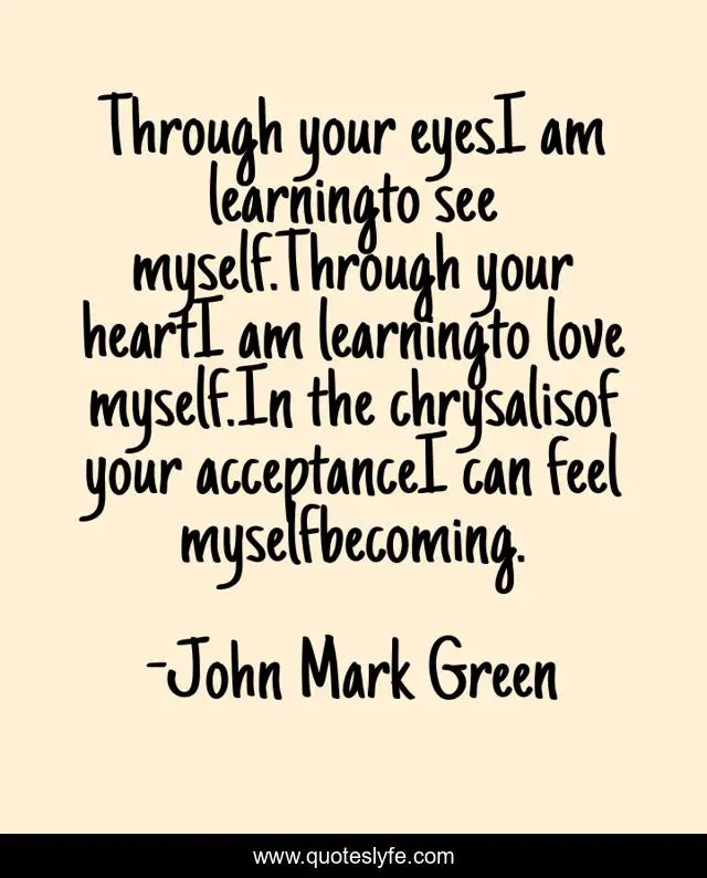 This page presents the quote "Through your eyesI am learningto see myself.Through your heartI am learningto love myself.In the chrysalisof your acceptanceI can feel myselfbecoming.". Author of this quote is John Mark Green. This quote is about love, love-and-sayings, relationship, acceptance, transformation, affection,.