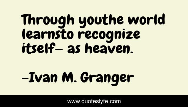 This page presents the quote "Through youthe world learnsto recognize itself— as heaven.". Author of this quote is Ivan M. Granger. This quote is about heaven, self-awareness,.