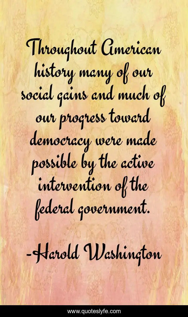 This page presents the quote "Throughout American history many of our social gains and much of our progress toward democracy were made possible by the active intervention of the federal government.". Author of this quote is Harold Washington. This quote is about progress, government,.