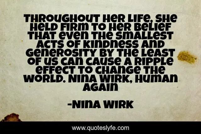 This page presents the quote "Throughout her life, she held firm to her belief that even the smallest acts of kindness and generosity by the least of us can cause a ripple effect to change the world. Nina Wirk, Human Again". Author of this quote is Nina Wirk. This quote is about change, enthusiasm, hope, inspirational,.