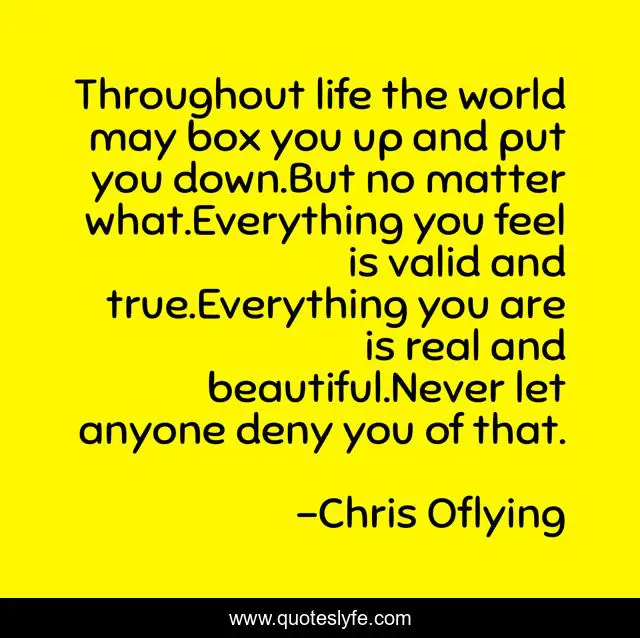 This page presents the quote "Throughout life the world may box you up and put you down.But no matter what.Everything you feel is valid and true.Everything you are is real and beautiful.Never let anyone deny you of that.". Author of this quote is Chris Oflying. This quote is about lgbt, youtube, inspirational, enthusiasm,.