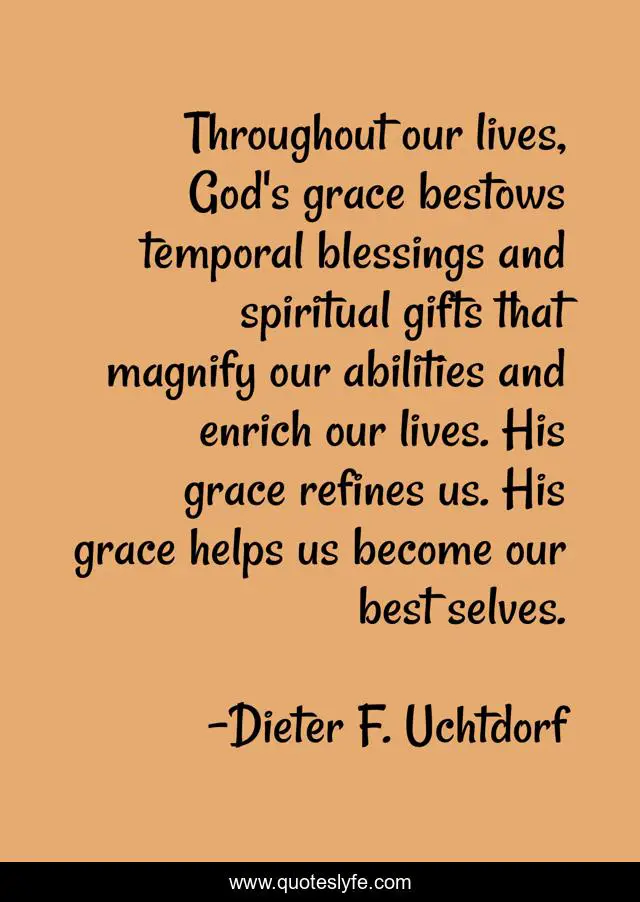 This page presents the quote "Throughout our lives, God's grace bestows temporal blessings and spiritual gifts that magnify our abilities and enrich our lives. His grace refines us. His grace helps us become our best selves.". Author of this quote is Dieter F. Uchtdorf. This quote is about god, spiritual, blessings,.