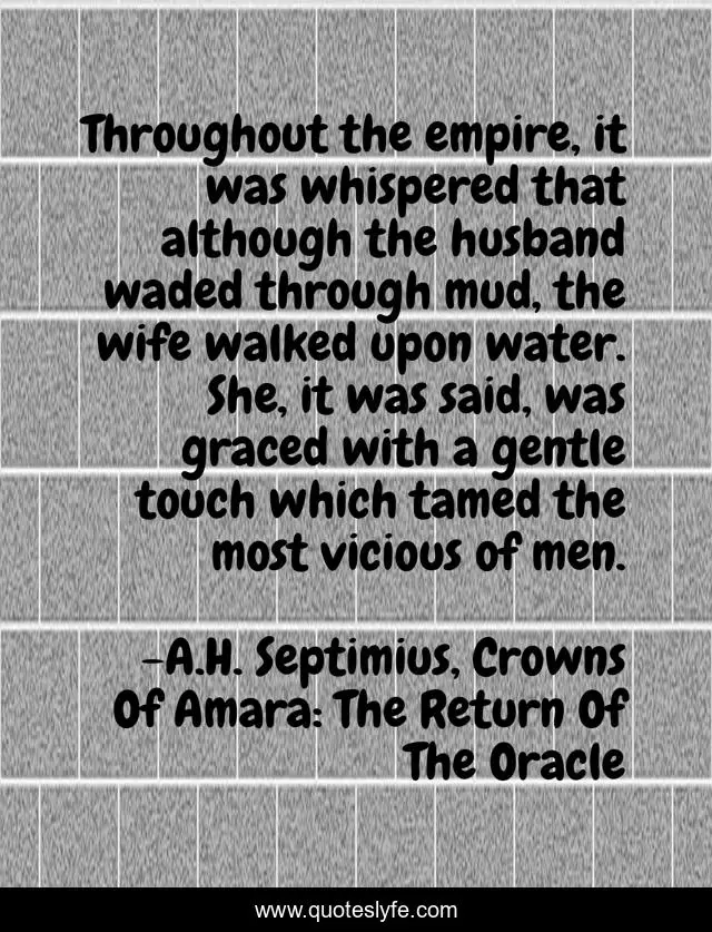 This page presents the quote "Throughout the empire, it was whispered that although the husband waded through mud, the wife walked upon water. She, it was said, was graced with a gentle touch which tamed the most vicious of men.". Author of this quote is A.H. Septimius, Crowns Of Amara: The Return Of The Oracle. This quote is about relationships, kindness, love, humanity, affection,.
